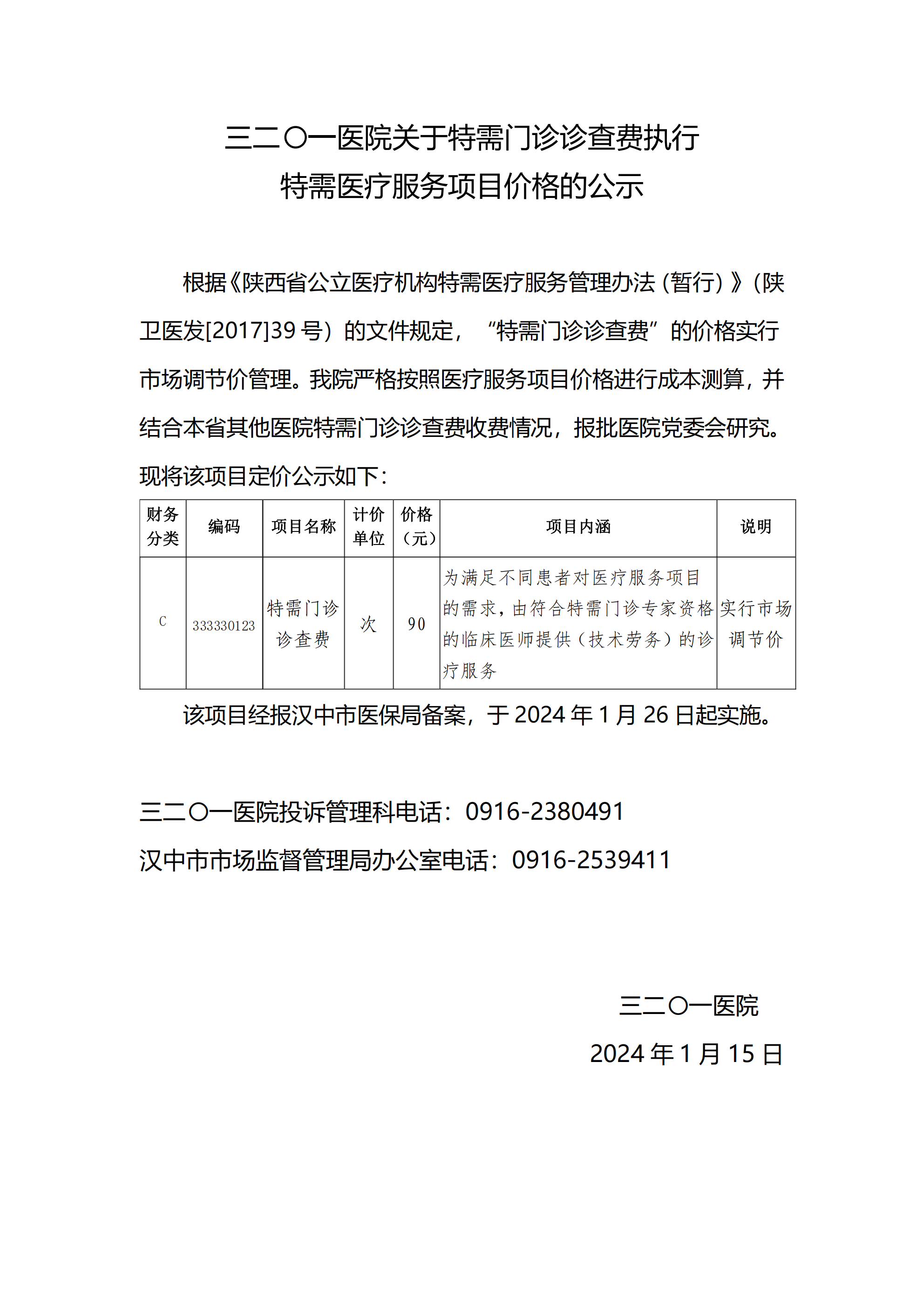特需服务项目与价格公示